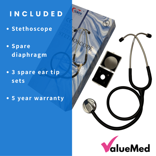 A stethoscope is the name of a type of medical equipment that is used to listen to the heart, the chest and the bowel sounds. Stethoscopes are also used to measure blood pressure with a manual sphygmomanometer. Stethoscopes are widely used by doctors, nurses, vets, paramedics and healthcare professionals.  We have a large range of stethoscopes for sale to suit all budgets , and clinical requirements.